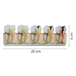 This detailed 2D dental model illustrates the progressive stages of tooth decay, starting from a minor enamel lesion and advancing through the dentin, reaching the pulp, and ultimately leading to the formation of a periapical abscess. The cross-sections of the tooth clearly depict the expanding damage at each stage, highlighting the involvement of the enamel, dentin, pulp, and surrounding tissues. Color-coding effectively differentiates healthy tooth structure from decay and infection. This model is an essential tool for patient education, emphasizing the importance of preventative care and timely intervention to avoid severe complications like abscesses. It’s also invaluable for dental students studying the pathogenesis and consequences of untreated dental caries